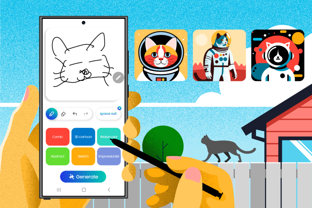 Digamos que quieres dar rienda suelta a tu imaginación. Con las capacidades multimodales de Galaxy AI, puedes dibujar un gato con el S Pen y, a continuación, escribir “traje espacial” para ponerle un traje espacial y enviarlo al espacio exterior. O dibujar la casa de tus sueños. Con el S Pen, haz un dibujo rápido de la fachada. Pero quizá no estés seguro de dónde quieres que esté la casa de tus sueños. Solo tienes que poner algunas ubicaciones posibles, como «junto a la playa» o «en la montaña», y Drawing Assist te ayudará a ver tu futura casa desde una nueva perspectiva.