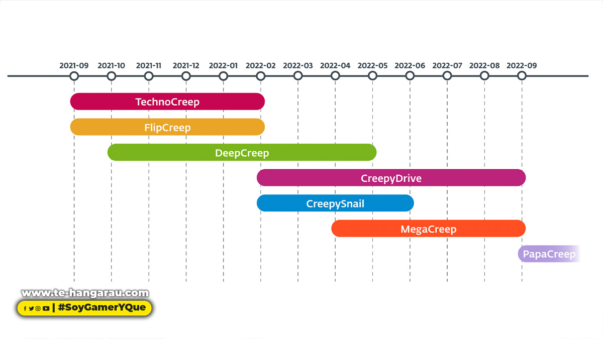 CreepyDrive, que abusa de los servicios en la nube de OneDrive y Dropbox para C&C; CreepySnail, que ejecuta comandos recibidos desde la propia infraestructura de los atacantes; DeepCreep y MegaCreep, que utilizan los servicios de almacenamiento de archivos de Dropbox y Mega, respectivamente; y FlipCreep, TechnoCreep y PapaCreep, que reciben comandos de los servidores del atacante. El grupo también ha utilizado varios módulos personalizados para espiar a sus objetivos.