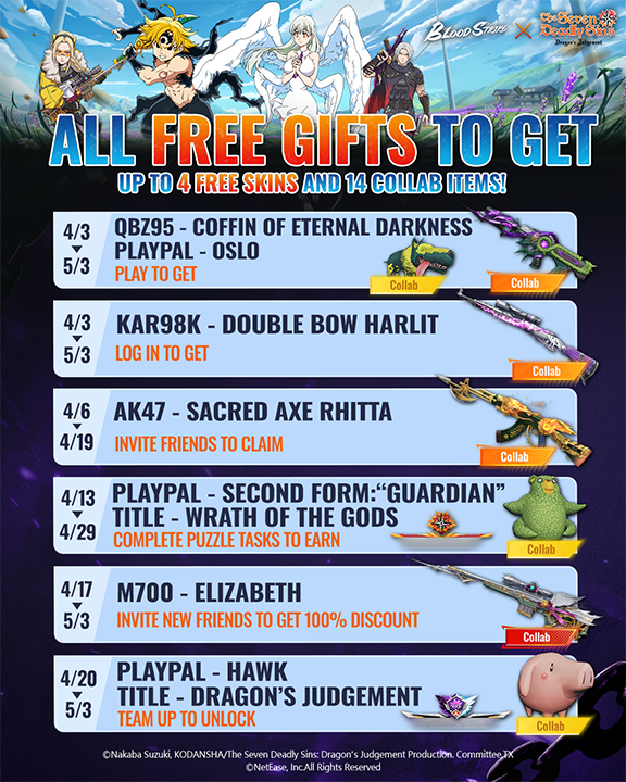 Guangzhou, China – 14 de abril de 2026 – El desarrollador y publisher NetEase Games se complace en anunciar el esperado evento de colaboración Blood Strike × The Seven Deadly Sins, que se encuentra ya disponible y estará activo hasta el 3 de mayo. Los Strikers de todo el mundo podrán adentrarse en el mundo de Britannia, desbloquear recompensas gratuitas y coleccionar skins, armas y cosméticos exclusivos inspirados en la popular serie de anime a nivel global.